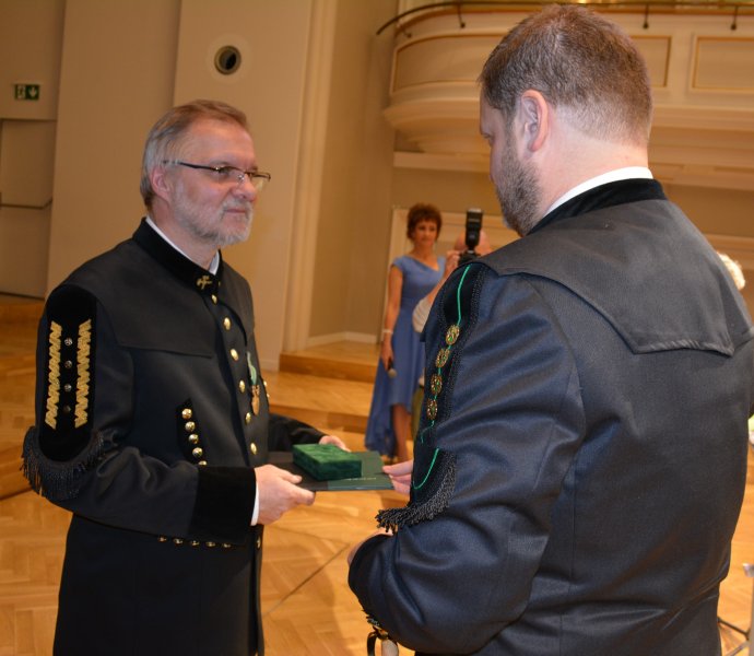 Uwzględniając długoletnią współpracę mającą na celu podnoszenie standardów bezpieczeństwa pracy w górnictwie, Prezes Wyższego Urzędu Górniczego postanowił wręczyć, sięgający tradycją dawnych wieków, symbol honoru, wolności i godności górnika, symbol władzy wyższych urzędników górniczych i nadzoru, honorową szpadę górniczą Panu Martinowi Štemberce, Prezesowi Czeskiego Urzędu Górniczego.